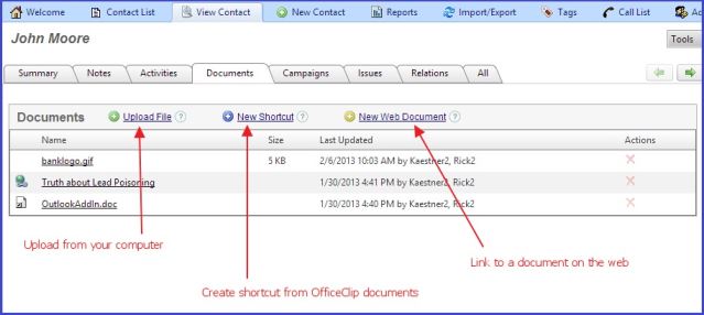 We have added two new ways to link your documents to OfficeClip CRM. In addition to uploading documents you can now create shortcut from the OfficeClip document repository and link to an arbitary document on the web.