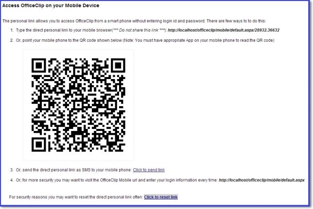 - QR code is added to the mobile link so that OfficeClip mobile website can be reached by pointing the smart phone camera to the screen.