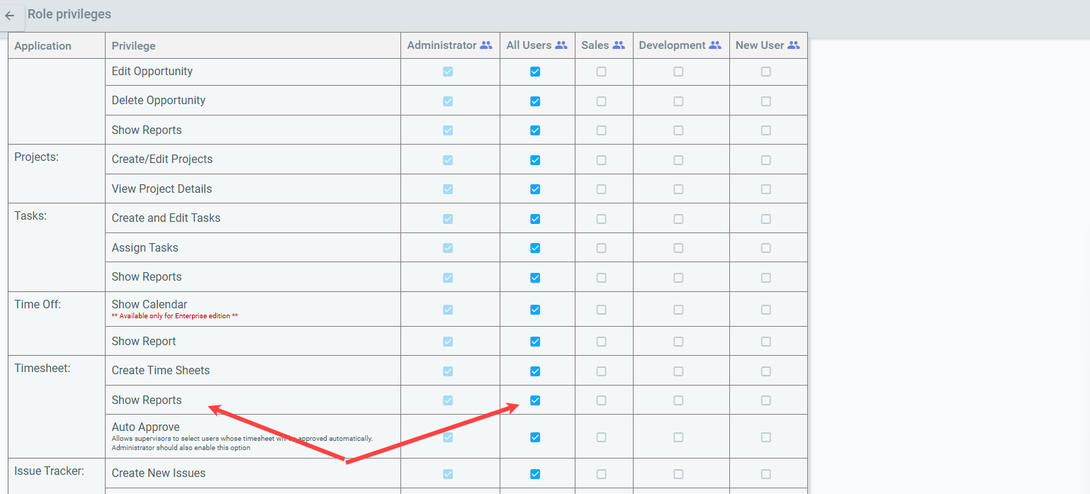 MenuForum NavigationForumMembersActivityLoginRegisterForum breadcrumbs - You are here:OfficeClip ForumsCustomer Corner: Good Practices (How To's)Reports not visible to non‑admin …Please Login or Register to create posts and topics.Reports not visible to non‑admin users in Timesheet applicationNarsimha Rao@narsimha23 Posts#1 · January 14, 2026, 10:55 amQuote from Narsimha Rao on January 14, 2026, 10:55 amThis issue is related to user privileges. To enable report visibility for non‑admin users, please follow these steps: Go to Settings Under Organization Settings, select Role Privileges Under Timesheet, check the Show Report option for all applicable users Check the image below for more information This issue is related to user privileges. To enable report visibility for non‑admin users, please follow these steps: Go to Settings Under Organization Settings, select Role Privileges Under Timesheet, check the Show Report option for all applicable users Check the image below for more information Post Reply: Reports not visible to non‑admin users in Timesheet application Cancel